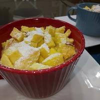 少しチーズをかけました。思っていたより時間がかかりましたが簡単で美味しかったです!分量は適当ですがうまくいきました。甘すぎず食べやすいです!