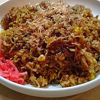 サラダ油はごま油を使用しても美味しく作れます。焼きそば麺とごはんは素早くほぐしながら炒めると、しっかり混ざり合って美味しい仕上がりになります。付属のソースが無い場合は、ウスターソースのみで代用しても作れますが、その際は分量を多めに入れて下さい。1の工程で、包丁で麺を切る時は、袋を一緒に切らないように気を付けてください。トッピングの青のりは無くても大丈夫ですが、あるとまた違ったアクセントになってオススメです。