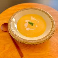黄色が鮮やかできれいなかぼちゃのスープです。かぼちゃの下茹では電子レンジで行うので時間短縮になります。フードプロセッサーで攪拌して、なめらかな舌ざわりに仕上げました。やさしいけれどもしっかりとした味です。ぜひ、作ってみてください。