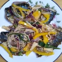 塩鯖しかなかったので、しょうゆをなしにして代わりに料理酒を増量して作ってみたらちょうど良かったです。紫玉ねぎは普通の玉ねぎで。分量的に黄パプリカが多かったのですが、色味を考えると赤パプリカかピーマンを多くした方が良かったですね。