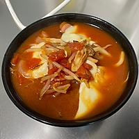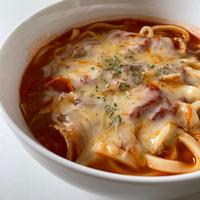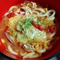 豚トマチーズうどんはいかがでしょうか。トマトベースのスープに豚バラ肉と玉ねぎを入れた、温かいうどんです。仕上げにピザ用チーズを乗せることで、コクを加えました。昼食や小腹が空いたときの夜食などにもおすすめです。ぜひお試しくださいね。