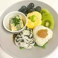 - 5 おにぎりを作ります。ごはんを半分に分けます。ボウルにご飯、塩昆布、ごま油を入れ混ぜ合わせ、三角形に握ります。