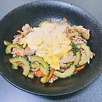 豆腐が切れていたので、味付けがちょっと濃くなりました。ゴーヤの苦味と卵のチーズが良く合います!