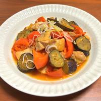 - 1 トマトは8等分のくし切りにします。ナスはヘタを取り除き、乱切りにします。