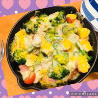 こんな美味しいお料理が自分で作れるなんて!感動しました〜!副菜作りの手前を省く為と彩りの意味で、茹でブロッコリーとプチトマト二つ割、余ってたウインナーも入れときました♪チーズはモッツァレラ、ピザ用ゴーダ(冷凍)、チェダースライスの三種!美味しい〜♪