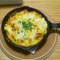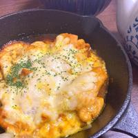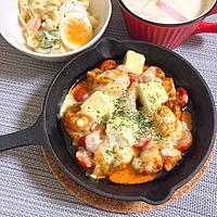 - 3 スキレットに入れてピザ用チーズをのせ、鶏もも肉に火が通るまでオーブントースターで15分ほど焼きます。