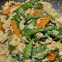 - 3 絹さやに火が通ったら、溶き卵を入れ、半熟になるまで中火で1分ほど加熱し、火から下ろします。