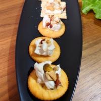 ナッツのハニーチーズカナッペはいかがですか。はちみつを混ぜこんだクリームチーズを塗ったサクサクとしたクラッカーに、甘じょっぱいナッツがよく合います。お酒のおつまみやちょっとしたおもてなしにもぴったりですよ。ぜひ、お試しくださいね。