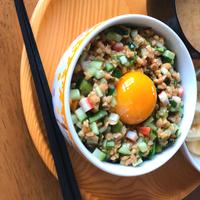 たくあんの代わりに余っていた柴漬けを使いました。カリカリした食感と納豆の柔らかい食感が合わさって食べ応えあります。卵黄と一緒に頂くとまろやかで美味しさアップ!