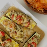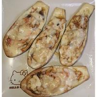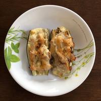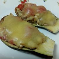 - 5 1に4を詰め、アルミホイルを敷いた天板にのせ、ピザ用チーズをかけます。オーブントースターでチーズが溶けるまで5分加熱し、お皿に盛り付けて完成です。