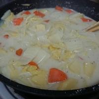- 4 牛乳を少しずつ加えてとろみが付いたら(B)を入れて弱火のまま20分程煮込みます。