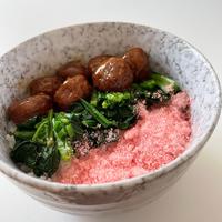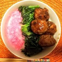 甘酢で絡めた肉団子とほうれん草、甘い桜でんぶをのせた三色丼のご紹介です。しっかりとした味付けで、甘酸っぱい肉団子とさっぱりとしたほうれん草、甘い桜でんぶがとてもよく合います。ぜひ作ってみてくださいね。