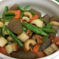 こんにゃくはあく抜き不要のものを使用しています。 塩加減は、お好みで調整してください。 絹さやは火通りがいいので、仕上げに入れてさっと炒めて加熱してください。