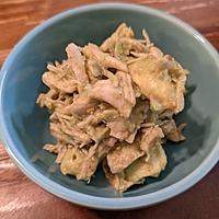 - 1 耐熱ボウルに鶏ささみと料理酒を入れ、ふんわりとラップをかけ、600Wの電子レンジで火が通るまで3分程加熱し、粗熱が取れたらほぐします。