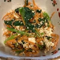 お惣菜の定番、白和えの紹介です。ごまの風味と豆腐のコクがよい相性です。今回は小松菜とにんじんにしましたが、ほうれん草や春菊など冷蔵庫の残り物でおいしくできます。ぜひお試しくださいね。