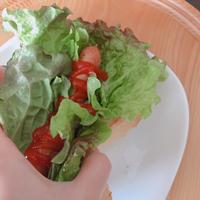 - 3 菜箸を外してサニーレタスを敷き、2のウインナーをのせ、再び半分に折りたたみます。