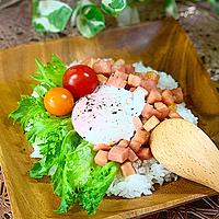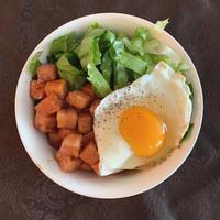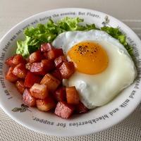 角切りにしたベーコンを照り焼き風の味付けで炒めて目玉焼きと一緒にごはんにのせていただくワンプレートごはんのご紹介です。ベーコンの旨味が染み出たタレごとごはんにのせることで、しっかりした味つけで味わいでいただけます。半熟に焼き上げた目玉焼きの卵黄のまろやかさもとてもよく合いますよ。