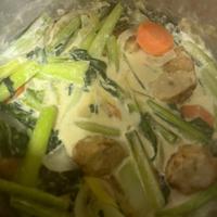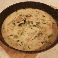 - 8 クリームソースの材料を入れ、ひと煮立ちさせたら、中火で3分程煮込みます。器に盛り付けて出来上がりです。