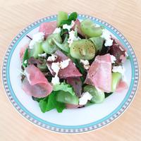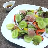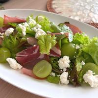 種なしの皮ごと食べられるシャインマスカットを主役に、爽やかで目でも楽しめるサラダに仕上がっています。甘いマスカットとカッテージのコク、塩気のきいた生ハムのバランスがとても良いです。是非、お試しください。