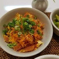 - 5 1を入れて中火で炒め、にんじんがしんなりしたら(A)を入れて炒め合わせます。3を回し入れ、大きくかき混ぜながら炒め、卵が半熟状になったら火から下ろします。