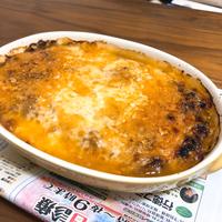 - 8 グラタン皿に残りの7、スライス切り餅の半量の順に2回重ね、7の残りの1/3、ピザ用チーズをのせます。