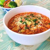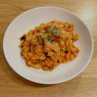 電子レンジで手軽に作れる時短レシピながら、ニンニクの香りが食欲をそそります。玉ねぎやベーコン、しめじなどの具材がたっぷり入って、トマトジュースのさっぱりとした酸味と相性抜群。仕上げにピザ用チーズをたっぷりのせれば、まろやかなコクが加わり満足度UP!フライパンで作る場合はバターを加えると、より本格的なリゾット風の一品に仕上がります。朝食やランチにぴったりの一皿です。