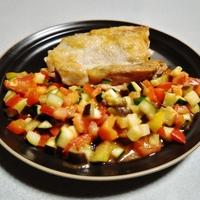 - 準備 鶏もも肉は肉の重量に対して1%の塩をふり、10分程置いて出てきた水分をキッチンペーパーで拭き取っておきます。黄パプリカ、赤パプリカはヘタと種を取り除いておきます。ズッキーニはヘタを切り落としておきます。トマトはヘタを取り除いておきます。