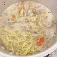 - 4 中華麺、残りの具材の材料を加えて、中華麺をパッケージの表記通り煮込み、牛乳を加えます。