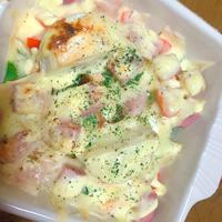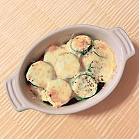 - 3 耐熱容器に1を入れ、その上に2を並べ入れます。ズッキーニの上にマヨネーズを塗り粗挽き黒こしょうを散らし、ピザ用チーズをのせたらオーブントースターで6分程焼きます。焼き色がついたら完成です。