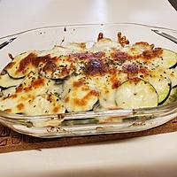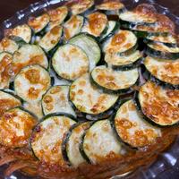 耐熱皿に盛り、上からズッキーニを並べて、モッツァレラチーズをふりかけで、オーブンで焼きました