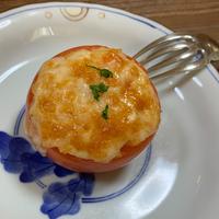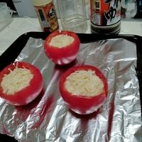 - 7 中身をくり抜いたトマトに6を詰め、3をかけます。