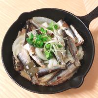 缶詰のオイルサーディンをスキレットに移して焼く簡単なおつまみです。新玉ねぎはやわらかく甘みがあっておいしいですよ。刻んだニンニクの加えて焼くと、パンチが出ますのでお好みでお試しくださいね。