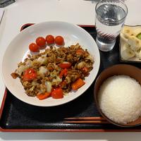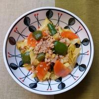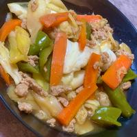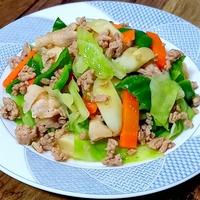 - 3 豚ひき肉の色が変わってきたら、キャベツ、にんじん、ピーマン、長ねぎを入れて中火で炒めます。