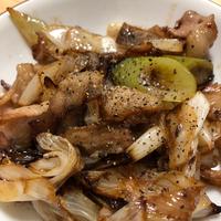 【旦那用】薄切り豚ロース90程・長ねぎ約1/2・オイスター酒バター半量・仕上げに黒胡椒、これで1人分。味付け濃いめだけど白米に合うと✏️