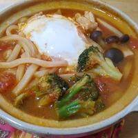 トマト鍋焼きうどんのご紹介です。カットトマト缶を使った、洋風な鍋焼きうどんです。彩りもよく、食欲をそそる一品ですよ。簡単にできて、ほっと温まります。ぜひ作ってみてくださいね。具材はお好みでアレンジしてください。