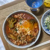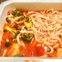 ブロッコリー80gは多い気がして60gに変更。ブロッコリーしめじ入れてからの3分は短くて結局6分くらい煮ました。でもうどんが焦げ付きやすくてもっと短くするならブロッコリーは別茹でした方が良いかも。和風に飽きた時にトマト味が良いですね