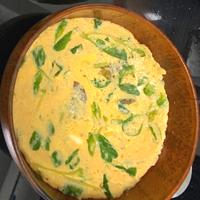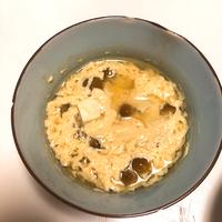 - 2 市販のなめこと豆腐のみそ汁、白だしを入れて混ぜ合わせます。耐熱容器に移して、ラップをかけ、200Wの電子レンジで卵が固まるまで7分程加熱します。