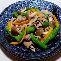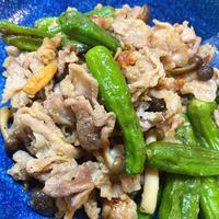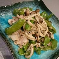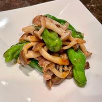 - 6 豚肉の色が変わったらししとうとしめじを加えて全体に油が回るまで中火で炒めます。