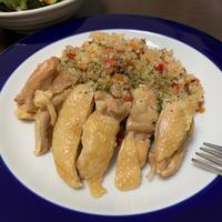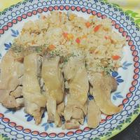 塩加減は、お好みで調整してください。米を入れて加熱している途中、水分が不足したら水を足します。鶏もも肉はコンソメ顆粒を入れたお湯で茹でることで中まで味が染みます。