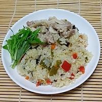 - 6 3分ほど炒め、全体に油がまわったら、4の煮汁400ml、(A)を入れ中火で炒めます。沸騰したら4の鶏もも肉を戻し入れ、蓋をして中火で15分程米に芯がなくなるまで加熱します。