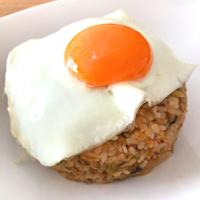 - 4 フライパンに卵用のごま油をひき、卵を入れ、中火で3分程焼き目玉焼きを作ります。