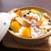 具材は、かぼちゃ、豚肉、しいたけ、里芋、しめじ、ごぼう、にんじん。