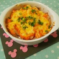 - 4 耐熱皿に1、2を交互に並べ、3、ピザ用チーズをのせます。豚バラ肉に火が通り、チーズに焼き色が付くまでオーブントースターで20分焼きます。