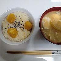 - 1 炊飯釜に米、もち米、塩、水を2合の目盛りまで注ぎ、栗の甘露煮、甘納豆ミックスを入れ、炊飯します。