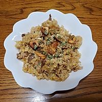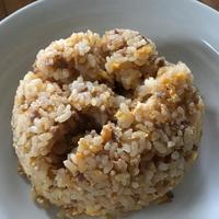 ごはん500g、豚挽220g、玉ねぎ1/2個、ニンニク4片、卵2個、オイスターソース大2、塩胡椒小1/4、米油小1、バター20g