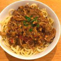 - 5 玉ねぎがしんなりしたら、牛豚合びき肉を入れて中火のまま炒めます。牛豚合びき肉がパラパラになったら1を加えて煮ます。