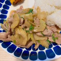 豚ロースで、エリンギ追加で。セロリの苦味が苦手なので、薄めに切って。セロリは葉も使いました。美味しかったです