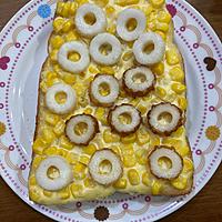 - 2 アルミホイルを敷いた天板に食パンをのせ、マヨネーズを塗り、コーンの水煮、1をのせます。
