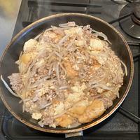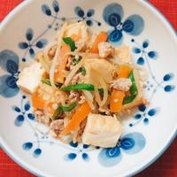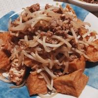 - 1 中火で熱したフライパンにごま油をひき、厚揚げを一口大にちぎって入れ、豚ひき肉を入れて炒めます。