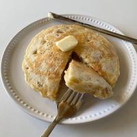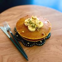 バナナの風味がふわっと広がる味わい深いホットケーキです。くるみで風味と食感が更に良いです。